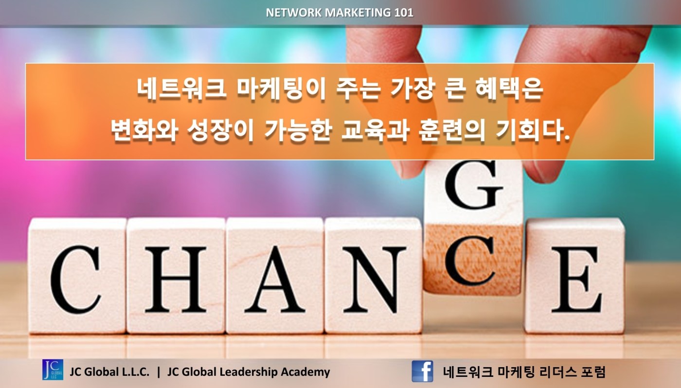 네트워크 마케팅의 진짜 기회는 전혀 준비되지 않은 분들에게 준비에 필요한 모든 것을 배율수 있는 기회를 제공한다는 것입니다. 직정이든 사업이든 일반적인 기회는 준비된 자가 시작해야 합니다. 투자가 필요하고 실수해도 되는 시간이 존재하지 않기 때문입니다. 하지는 네트워크 마케팅은 시작하고 배울수 있는 기회를 제공합니다.