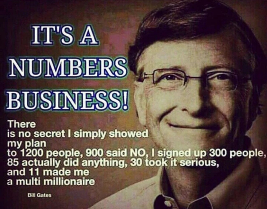 빌게이츠가 자신의 사업을 시작하며 자신의 계획을 약 1,200명에게 설명하였고, 그 중 900명은 “No”라며 거부하고 300명이 “Yes”, 그 중 80명 정도가 그래도 무언가 해보려 시도하고, 그 중 30명이 심각하게 받아들였습니다. 그리고 그 중 11명 때문에 그는 그의 꿈을 이룰수 있었습니다.