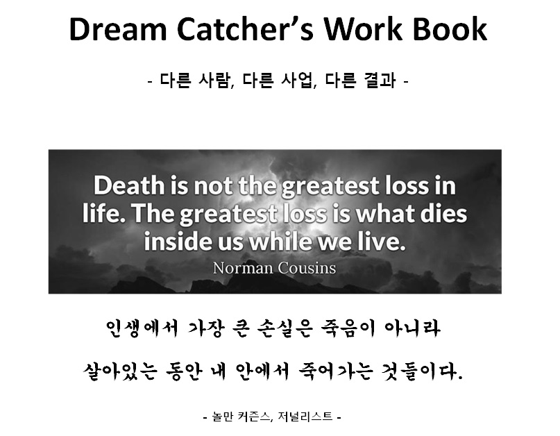 놀만 커즌스의 명언 또한 그것을 근간으로 하고 있습니다. 죽음보다 더 큰 손실은 내가 살아있는 동안 죽어가는 내 안의 꿈과 희망과 같은 것들입니다.