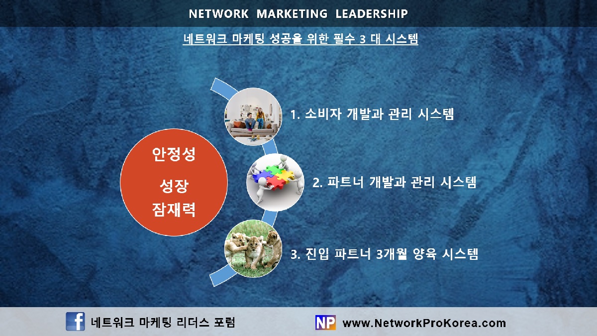 기업간의 차별성과 그 차별성이 제공하는 한 개인의 선택의 폭, 그리고 현실적 가능성과 미래 성장 잠재력을 가늠해 볼 수 있는 것이 바로 시스템입니다. 물론 여러 관점에서 정리할 수 있겠지만 네트워크 마케팅과 관련하여 사업자의 입자에서 보아야 하는 3대 시스템, 그리고 리더로서 끈임 없는 고민의 대상이며 혁신의 대사이기도 한 그 성공 3대 필수시스템의 개념을 정리해 볼까 합니다.