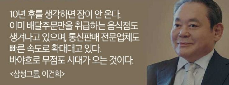 이제 1997년의 이건희 회장의 무점포 시대에 대한 예측을 20여년이 지난 지금 그것을 의심하는 사람은 아무도 없을 것입니다. 온라인의 확장으로 인한 엄청난 변화를 우리는 이미 체험하고 있으며 수많은 유명 브랜드의 오프라인 매장들이 이미 문을 닫고 있는 것을 보고 있습니다. 롯데의 백화점과 마트 중 약 200여개가 문을 닫는다는 것은 이미 알려진 뉴스이기도 합니다. 이제 유통의 전체적 흐름이 유점포에서 무점포로 가고 있다는 것은 부인할 수 없는 현실인 것입니다.