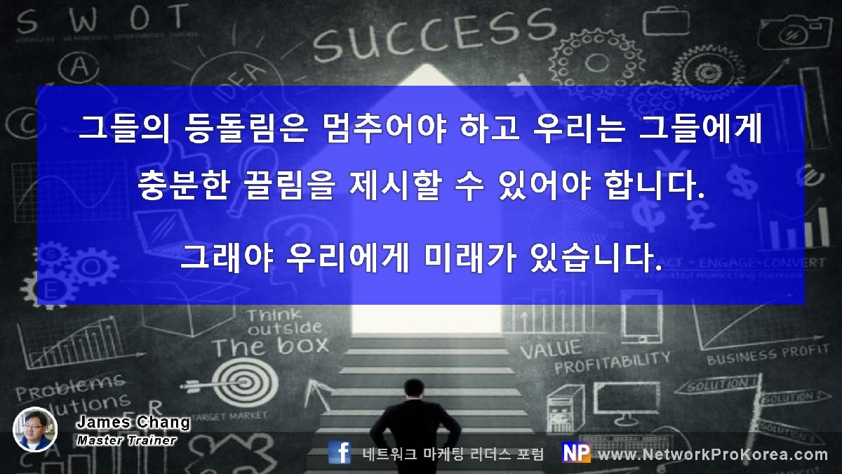 저는 그저 리더 여러분들과 밀레니얼 세대가 교육 시장과 문화에 끼치는 영향력을 보며, 네트워크 마케팅 안에서의 그들의 동향과 업계의 미래를 생각해 보고자 하는 것입니다. 이것은 모든 리더들에게 주어진 과제라는 것은 동의하시리라 생각합니다. 어쨌든 그들의 등돌림은 멈추어야 하고 네트워크 마케팅 업계는 그들에게 충분한 끌림을 제시할 수 있어야 합니다. 그래야 미래가 존재할 수 있기 때문입니다.