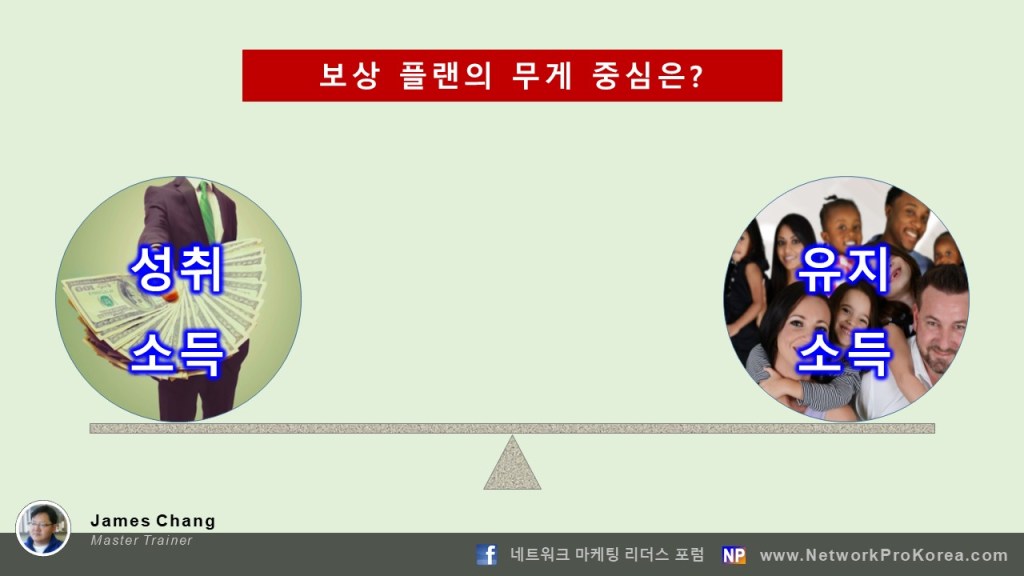 그렇다면 보상플랜을 분석할 때 보아야 하는 것은 성취소득과 유지소득의 균형일 것입니다. 혹시 성공을 이야기하고 리더가 되는 것을 이야기하고 계십니까? 그렇다면 그렇게 성장하는 과정속에서 조직은 커지고 섬겨야 할 파트너들이 많아질 것입니다. 그리고 파트너들의 재정적 니즈의 평균은 아마도 성취소득과 유지소득 사이에 중간 어디쯤 있을 것입니다. 그렇다면 보상플랜을 분석함에 있어서도 그 균형을 생각해야 합니다.