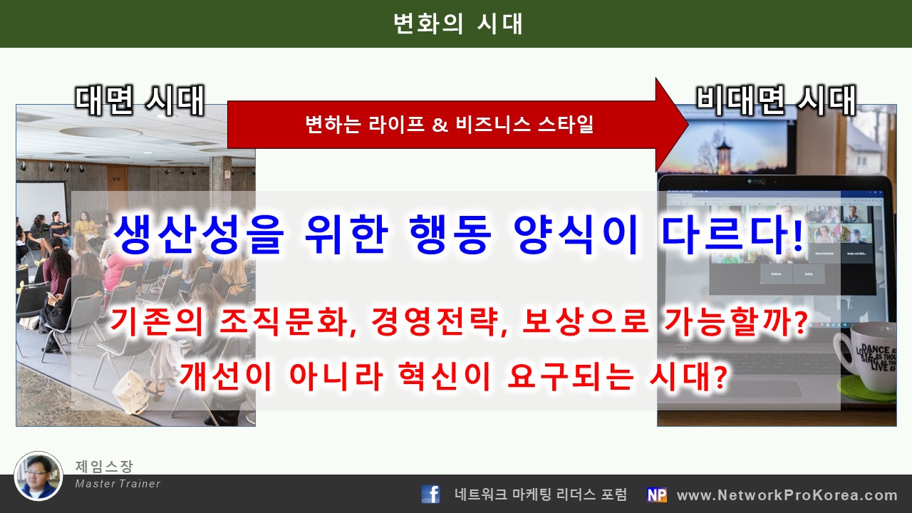 네트워크 마케팅 또한 그 변화를 피해 갈수는 없다. 이미 팬데믹이 시작되기 수년전부터 만남을 통한 구전의 개념에서 온라인을 통한 호기심 유발과 정보전달의 행위로 그 생산성을 위한 행동 양식이 바뀌어 오고 있었다. (팬데믹은 그저 그것을 가속화 시켰을 뿐이다.) 이제는 모여서 으쌰으싸 하는 시대가 아니라 인스타그램, 페이스북과 같은 SNS를 통해 혼자 일하는 시간이 더욱 많아졌다. 어찌보면 그만큼 조직의 결집보다는 개인의 자기관리가 더욱 필요한 시대가 되고 있다는 것이다.
