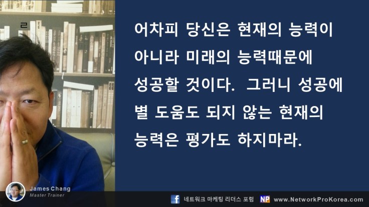 기억해라. 현재의 능력가지고 가져보지 못한 것을 가질 수 없다. 당신은 미래의 능력때문에 성공하게 될 것이다. 그러니 무엇이던 해보라는 기회를 주는 리더에게 감사하고 무조건 해보는 것이다. 그것이 미래의 능력을 키우는 유일한 방법이다.