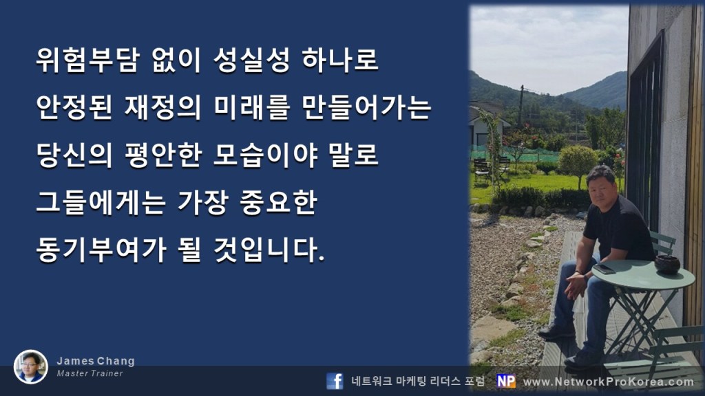 생각해 보십시오. 당신의 소득이 안정된 소득이 되고, 연금성 소득은 차근차근 늘어나고 있습니다. 당신의 모습은 점점 안정감을 찾을 것이고 당신의 주변 사람들은 당신에게서 평안의 기운을 느끼게 될 것입니다. 그들이 부러워하는 삶의 모습을 보여줄 수 있게 된다는 것입니다. 그것은 그리 큰 소득이 아니어도 됩니다. 안정된 1~2백만원의 소득만 되어도 가능할 것입니다. 위험부담 없이 성실성 하나로 안정된 재정의 미래를 만들어가는 당신의 평안한 모습은 그들에게는 가장 중요한 동기부여가 될 것입니다.