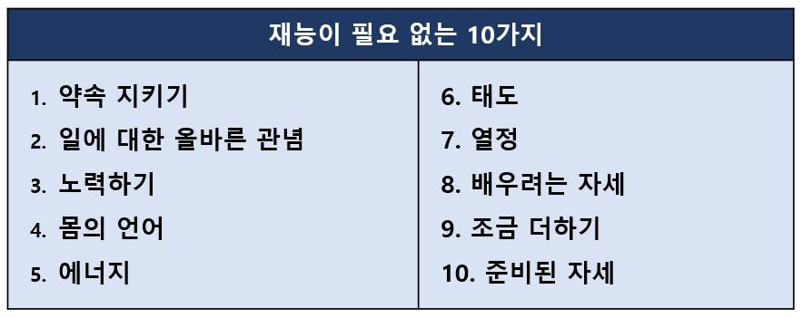 성공을 위해 특별한 재능이 필요 없는 것들이 있다. 우선 그것들을 잘해야 한다. 위에 도표에 있는 것들을 자세히 보라! 그 어느 하나도 특별한 재능이나 능력이 요구되는 것은 없다. 그저 삶을 대하는 자신의 태도와 연관된 것이고 다행히도 약간의 의도적 훈련을 통해 가능한 것들이다. 무엇보다 먼저 일단 잘하고 있어야 하는 것들인 것이다.