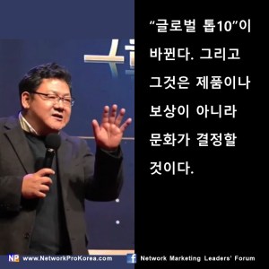 네트워크 마케팅의 특성상 문화는 어느 업계보다 중요하다. 제품과 보상이 좋아 어느 정도는 되는 것 같더니 무너지는 기업, 업계의 높은 순위에 올라서며 위용을 자랑했던 기업들의 추락하는 모습에서 우리는 그것이 제품과 보상의 문제라기 보다는 문화의 문제였음을 쉽게 볼 수 있다. 이것을 이해한다면 “글로벌 Top 10″은 제품이나 보상이 아니라 문화로 가능하게 된다는 것을 이해할 수 있으리라 생각한다.