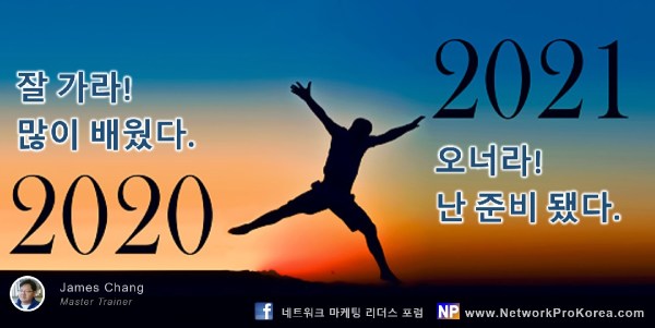 네트워크 마케팅을 하는 우리들에게 가장 중요한 자산이 되는 시간이 이렇게 흘러 벌써 2020년의 끝과 2021년의 시작을 바라보고 있습니다. 혹시 2020년을 마무리하며 2021년을 시작하며 목표 점검과 새로운 목표 설정에 조금 멍한 느낌은 들지 않으십니까? 그렇다면 2020년 지난 1년 동안 가장 잘한 것 세가지를 생각해 보면 어떨까요? 그리고 그것들은 더 잘할 수 있는 2021년을 생각하고 계획해 보는... Continue Reading →